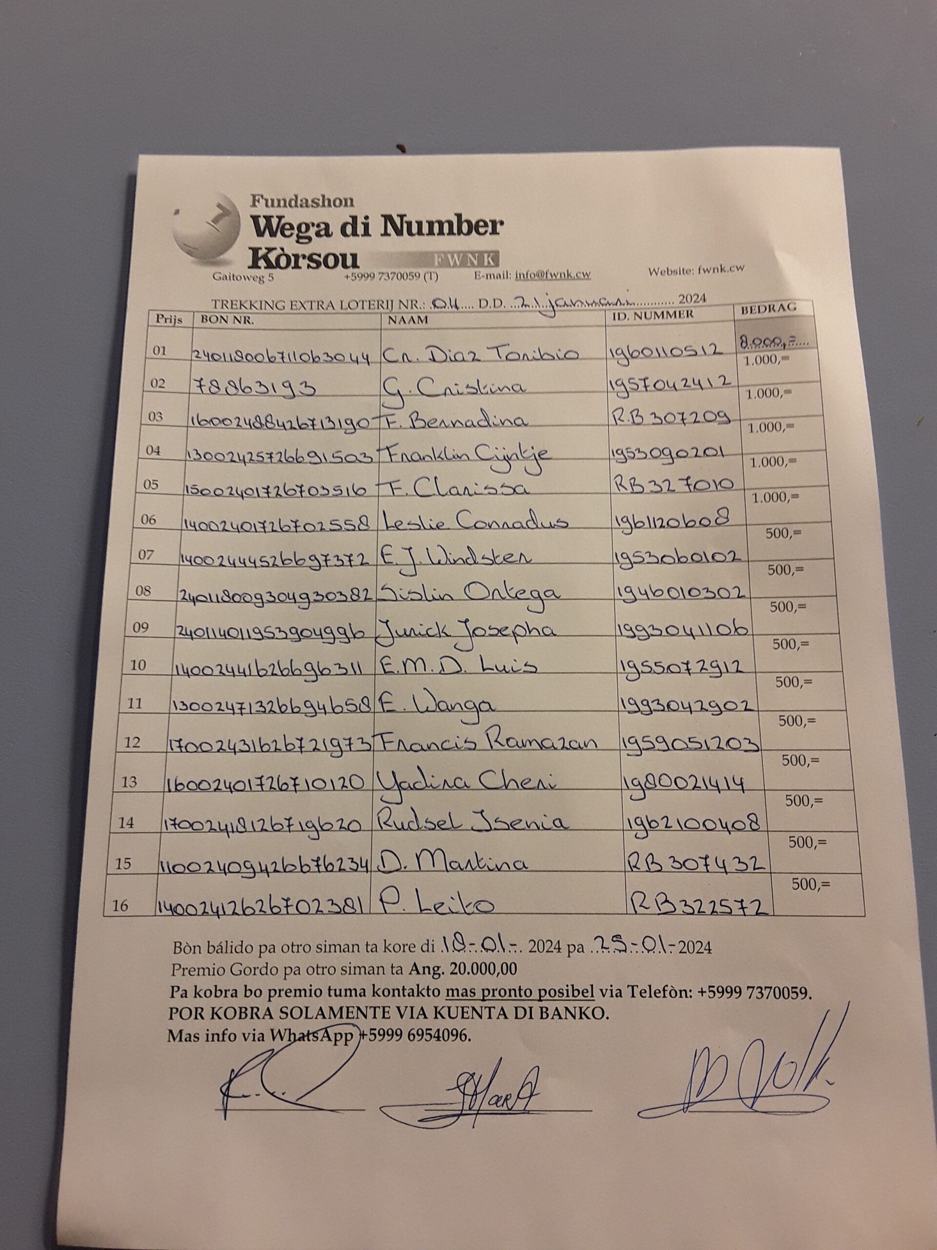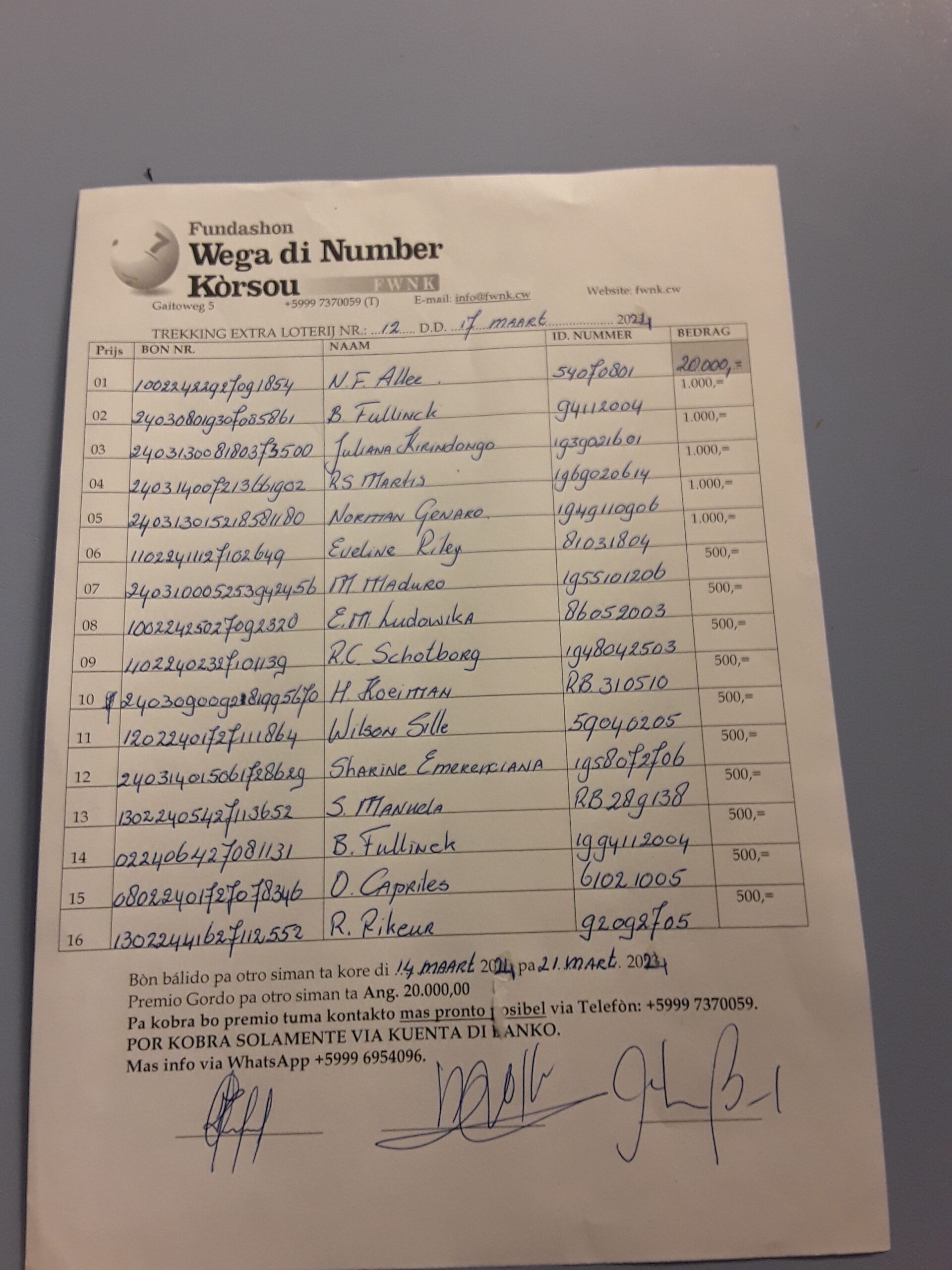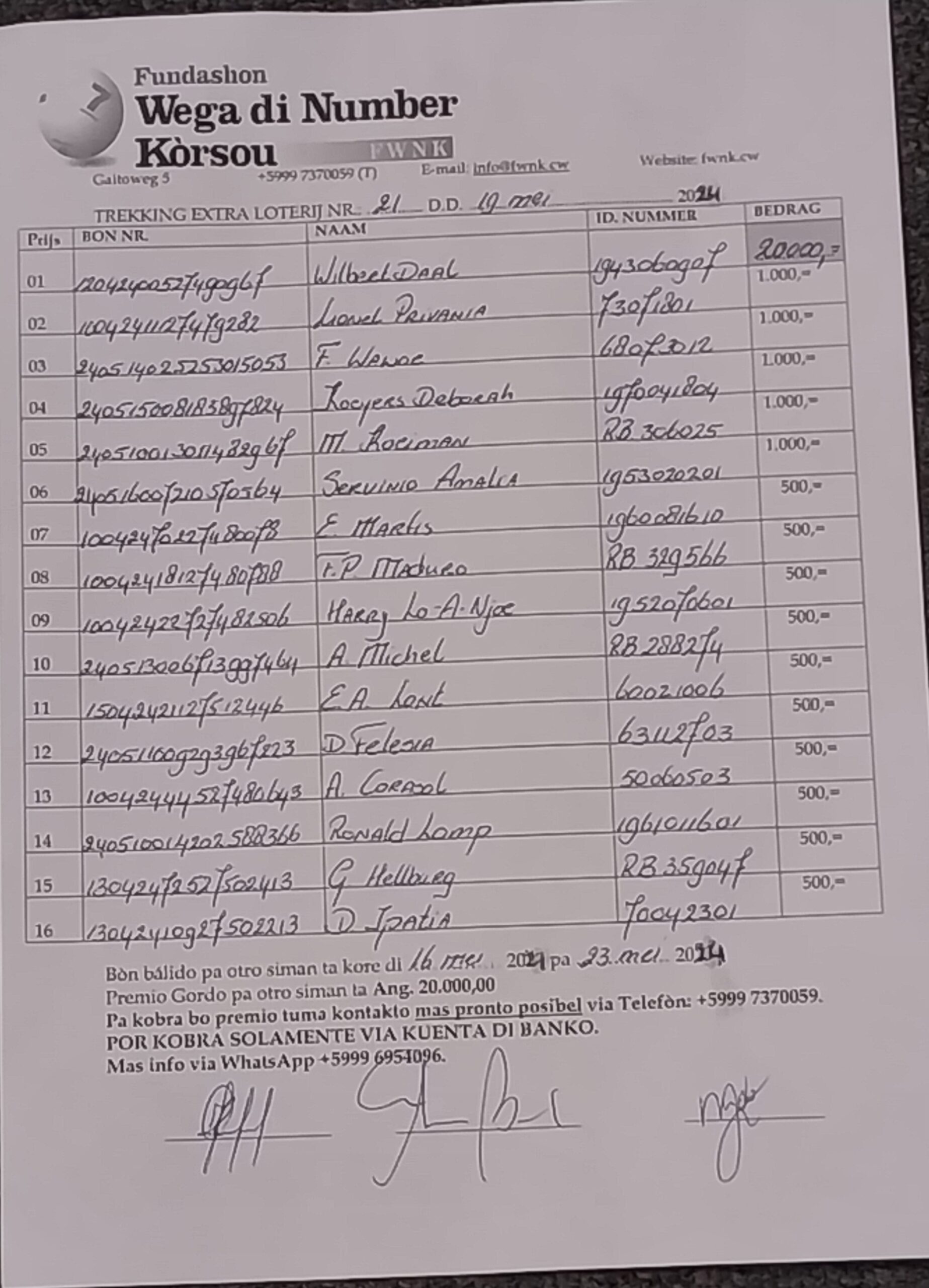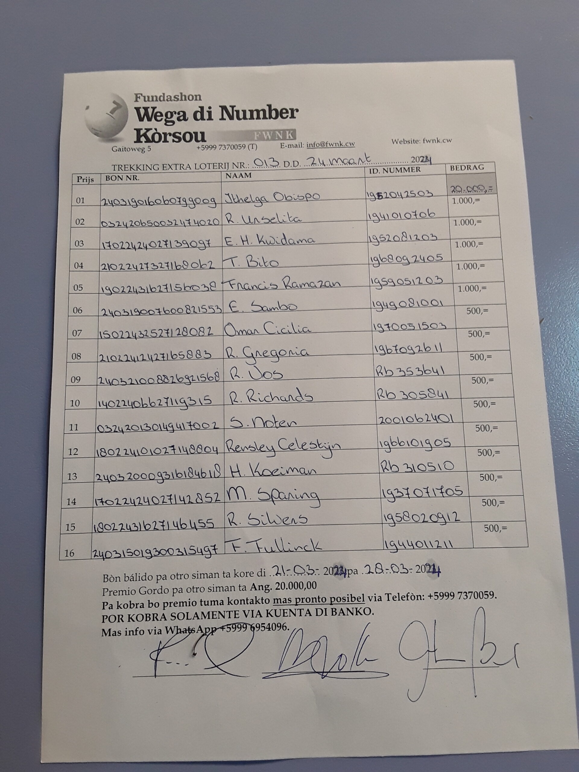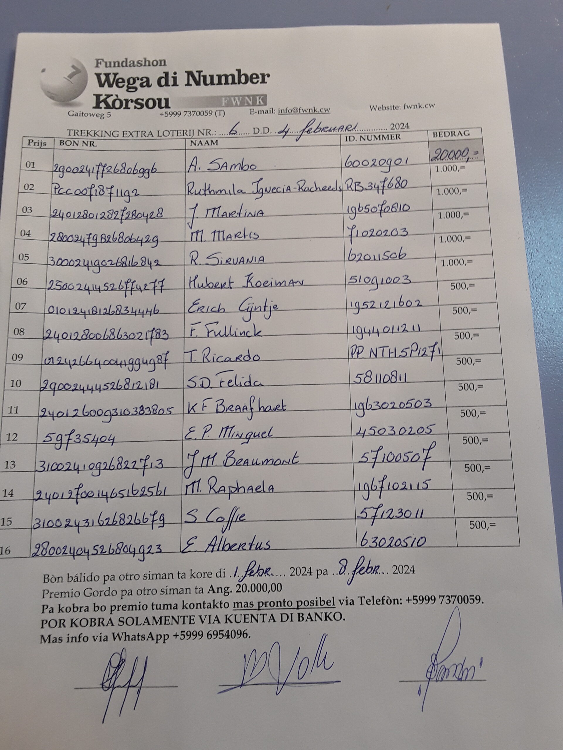 FWNK na telefòn: +5999 7370059 òf whatsapp: +5999 6954096.