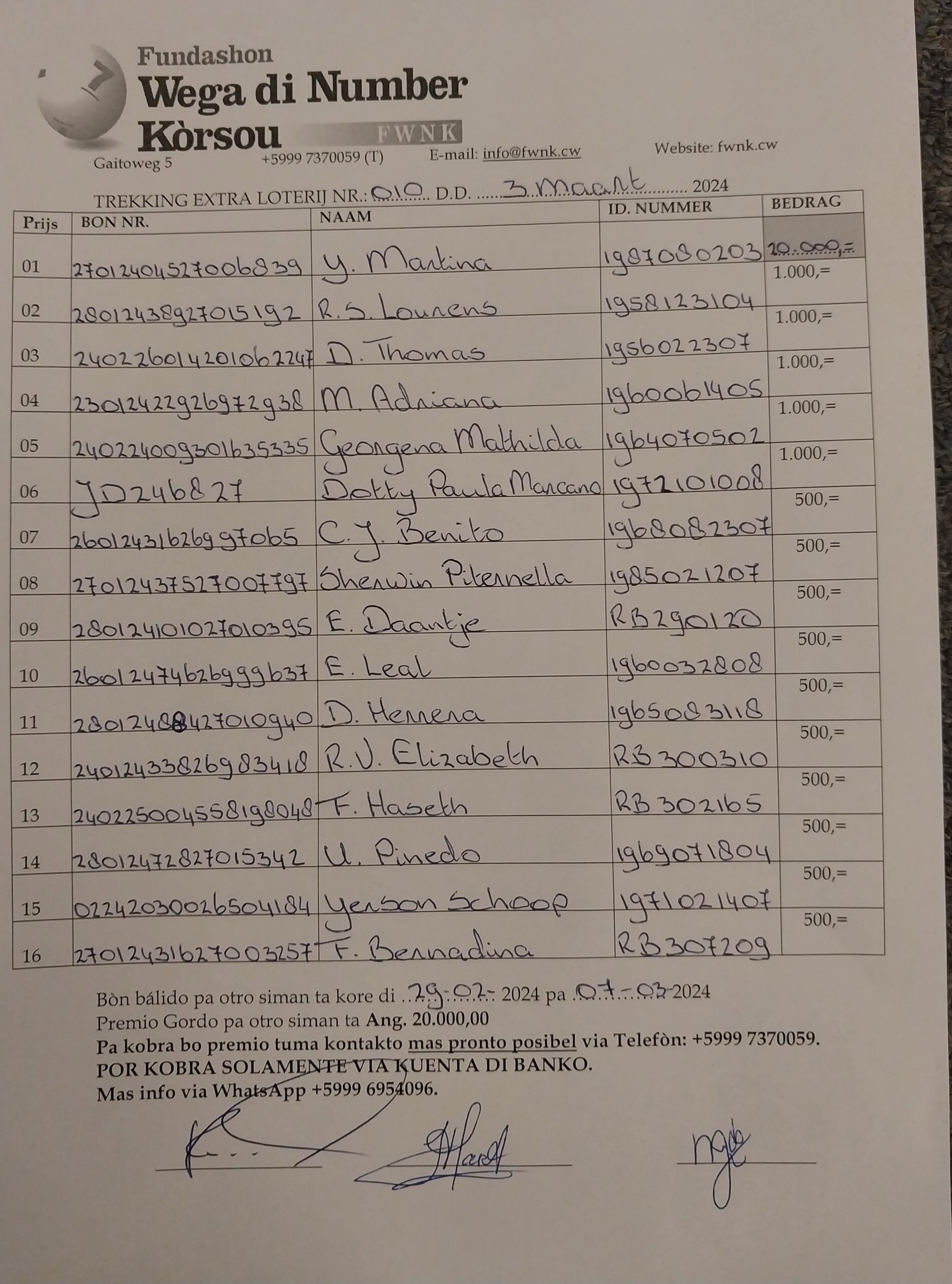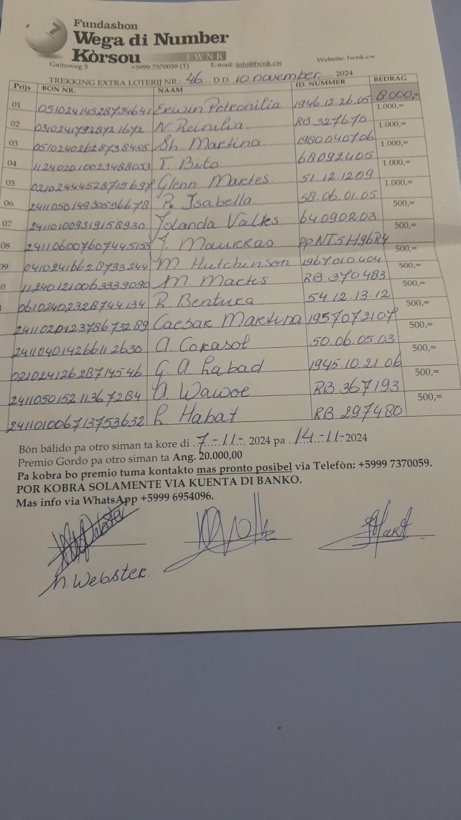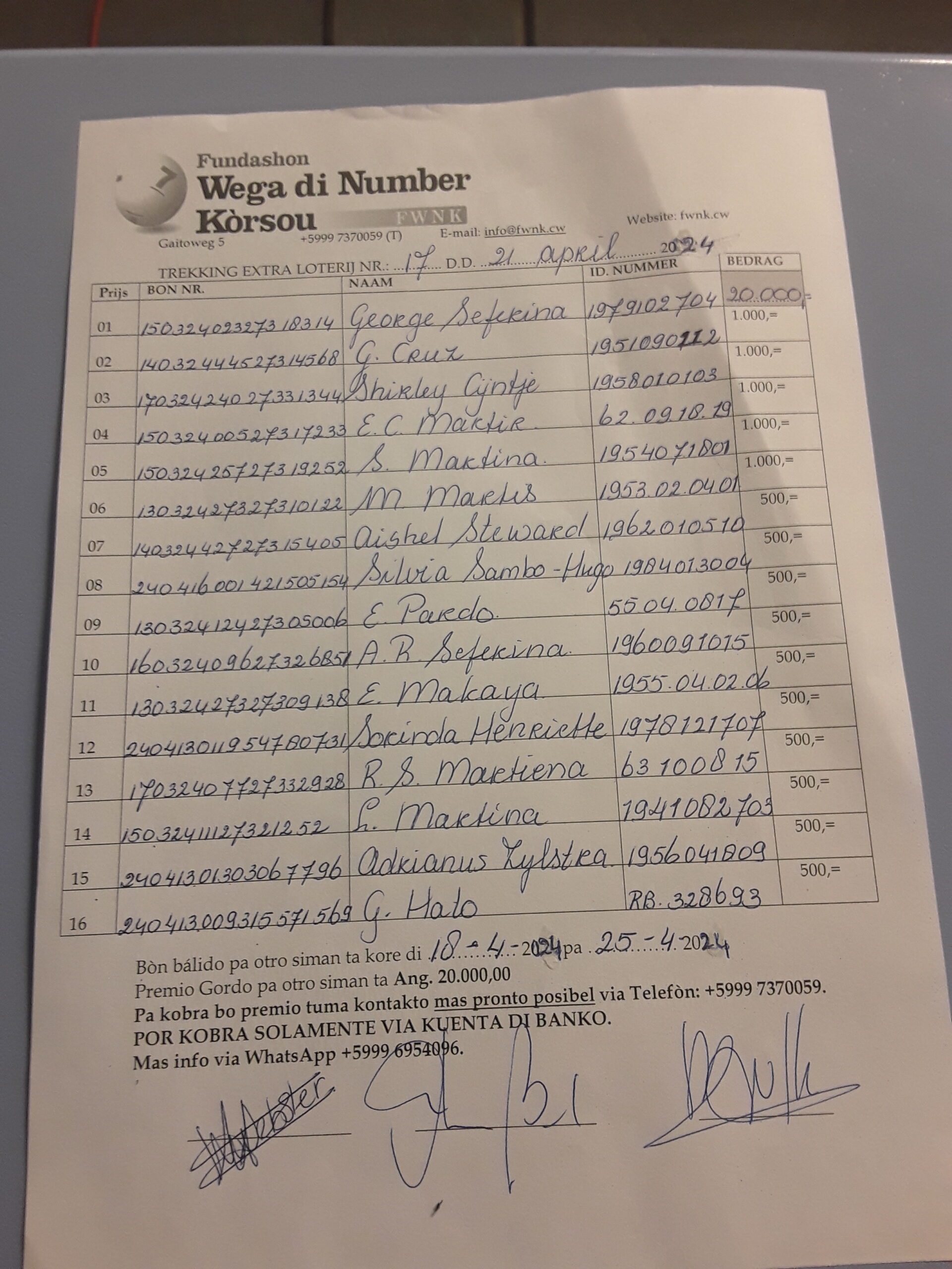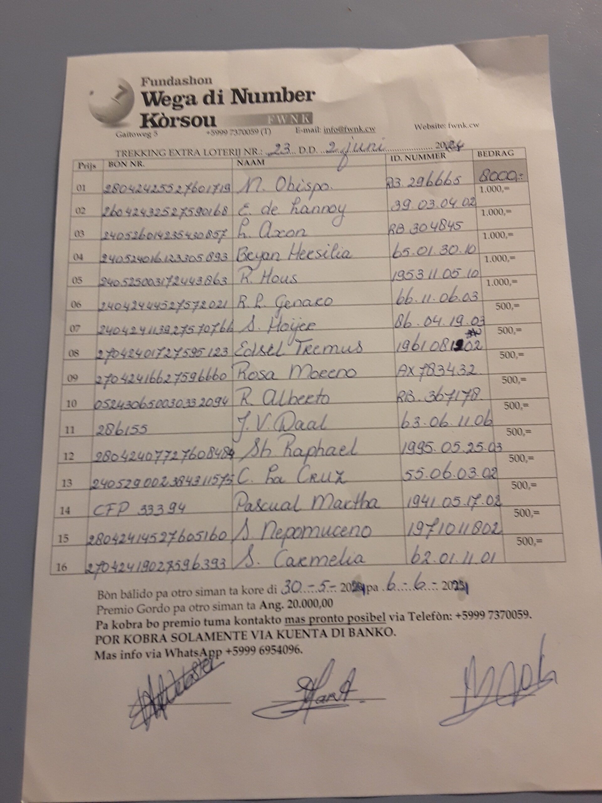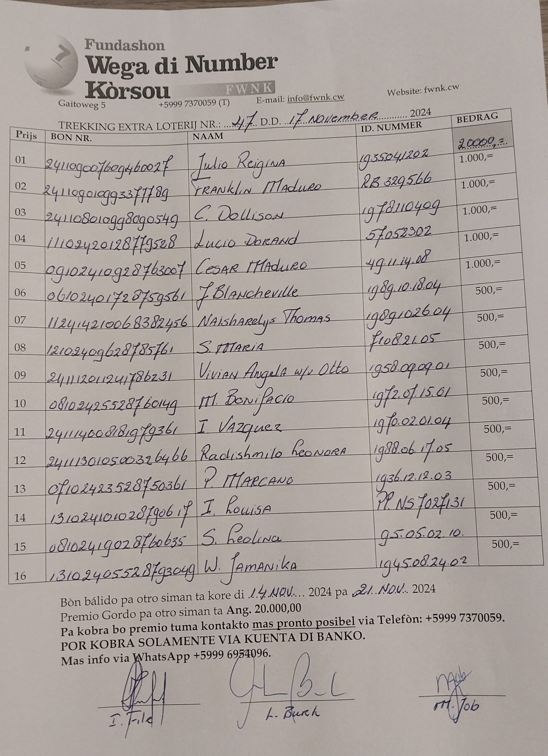 FWNK na telefòn: +5999 7370059 òf whatsapp: +5999 6954096.