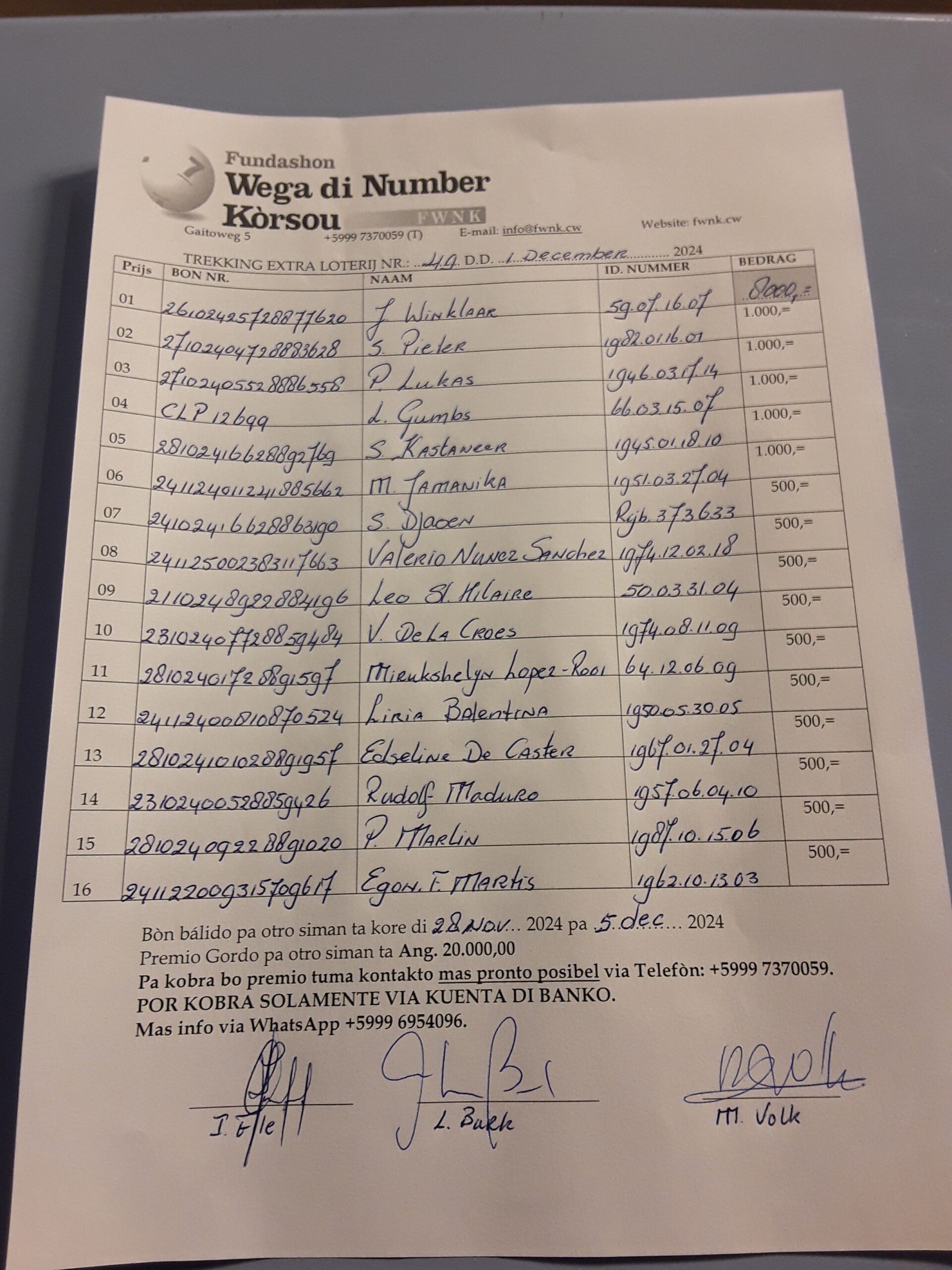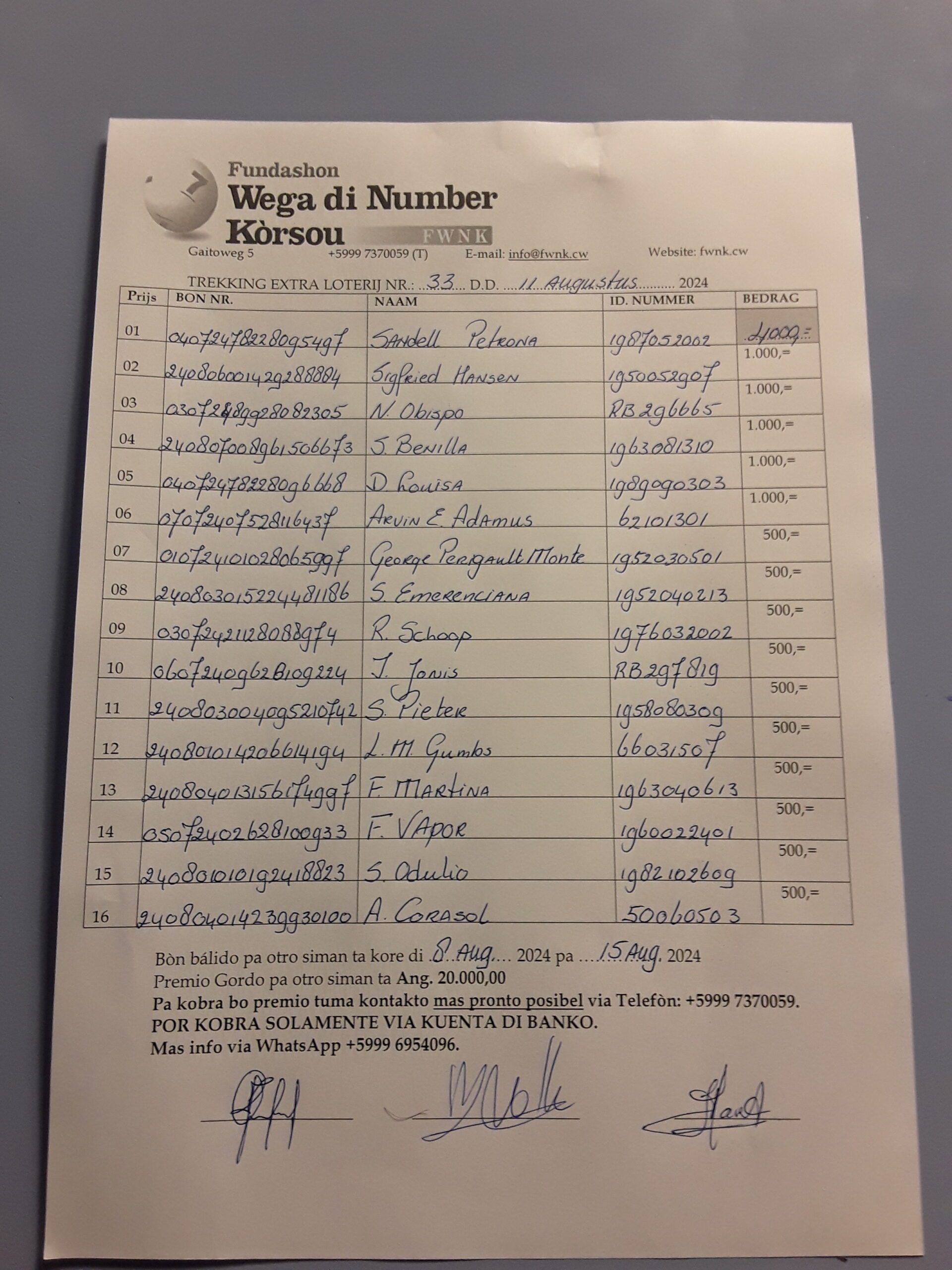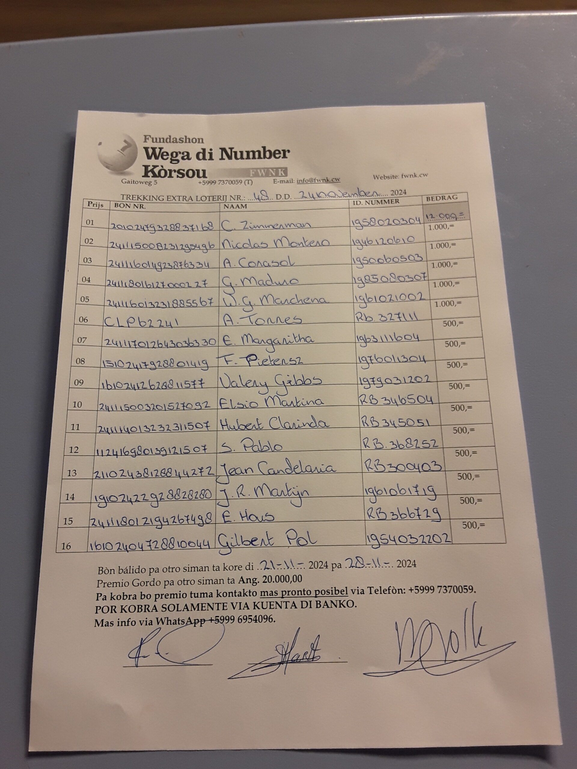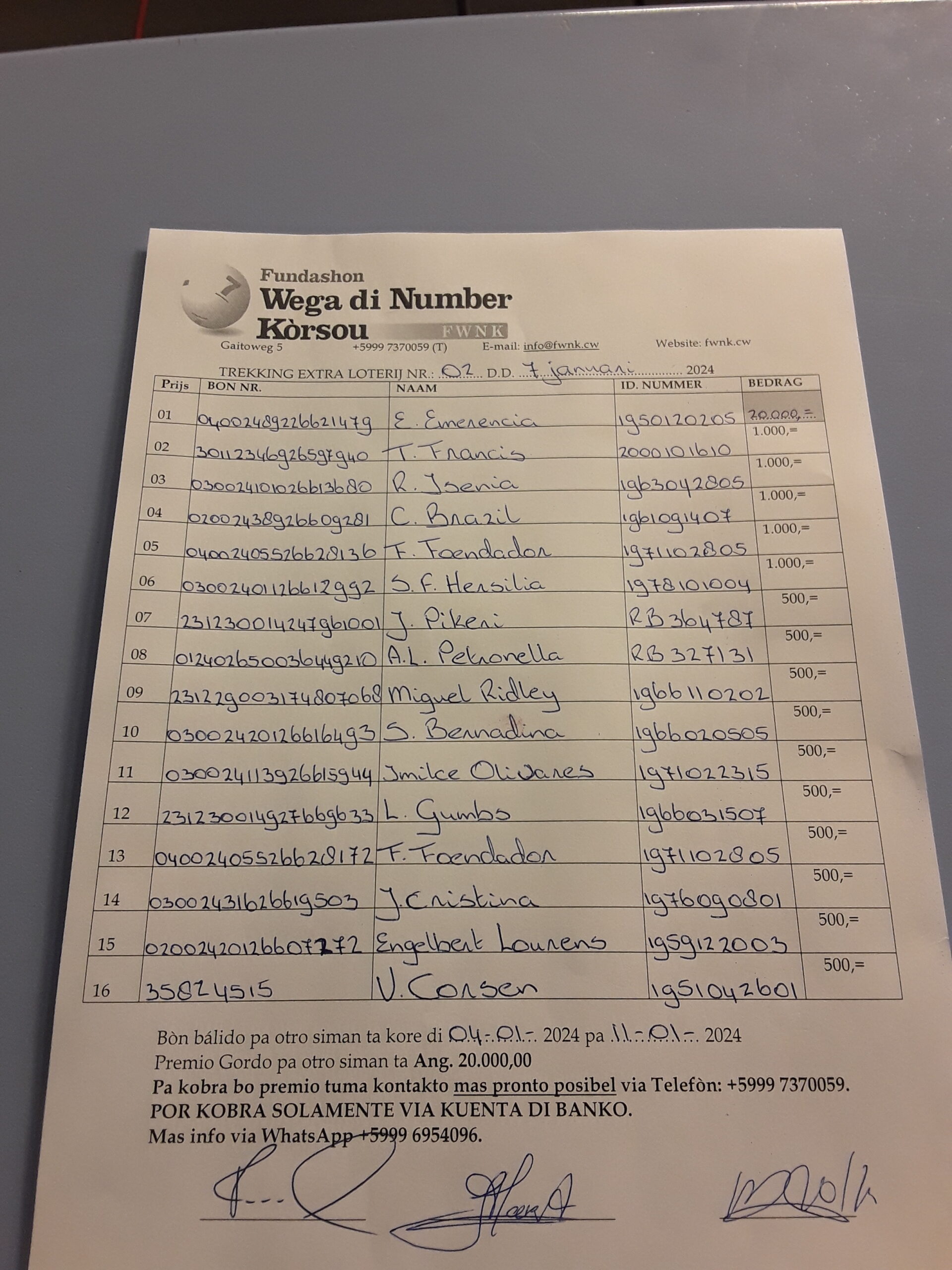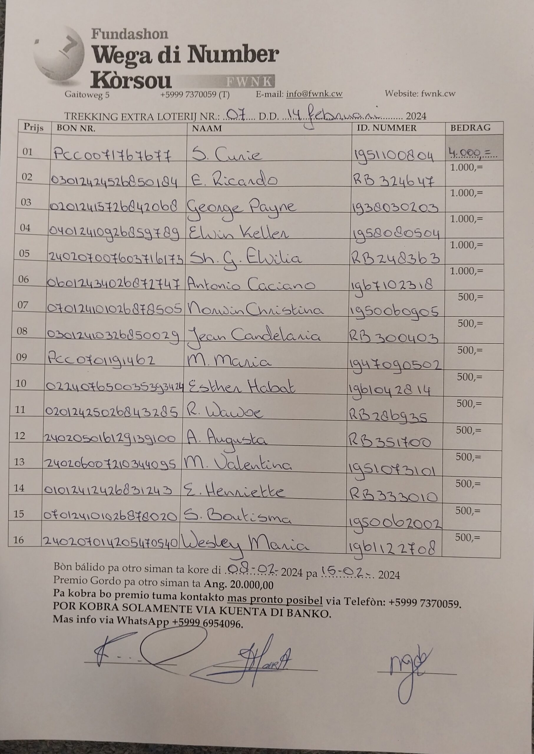 FWNK na telefòn: +5999 7370059 òf whatsapp: +5999 6954096.